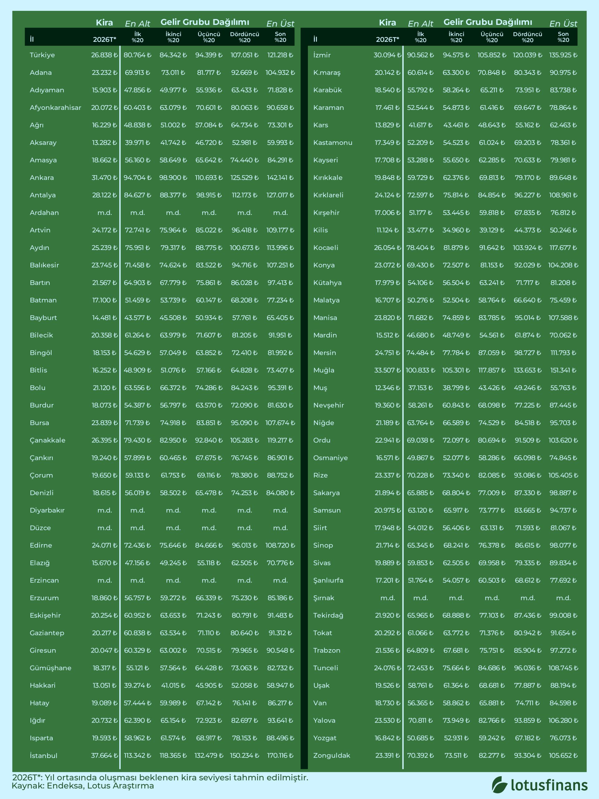İllere göre Endeksa kira verilerini baz alıp 2026 yıl ortası için beklenen kira seviyesini (2026T) enflasyon varsayımıyla projekte ettik. Ardından TÜİK’in hanehalkı bütçesinde konut+kiranın gelir gruplarına göre payını dikkate alarak, “kira yükü bu oranlarda kalacaksa hane gelirinin yaklaşık kaç TL olması gerekir?” sorusunu yanıtladık.