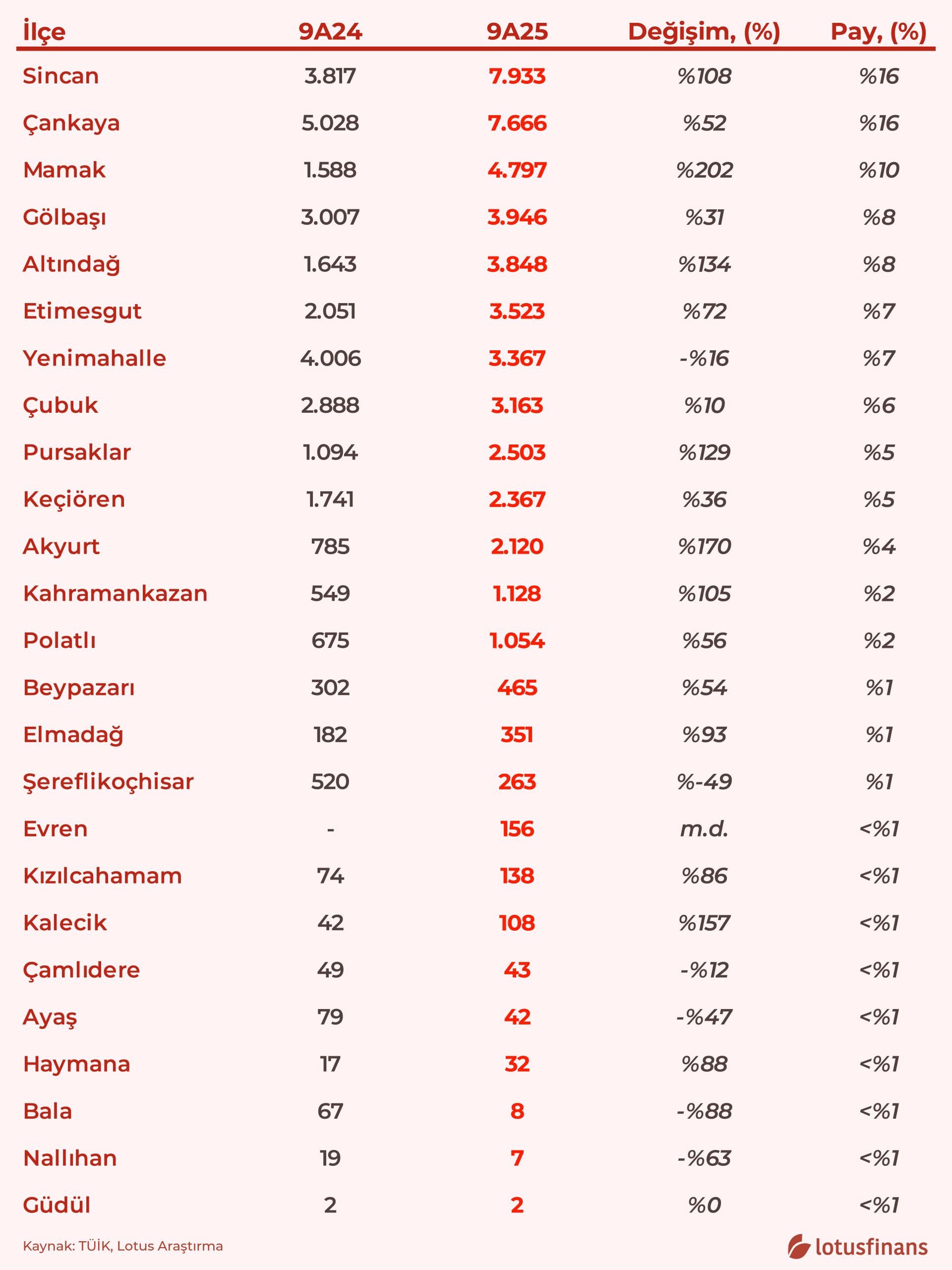 Sincan–Çankaya hattı toplam hacimde öne çıkıyor. Bu iki ilçeyi; Mamak, Gölbaşı, Altındağ, Etimesgut ve Yenimahalle gibi Ankara’nın hem dönüşüm hem de yeni yerleşim akslarını temsil eden ilçeler takip ediyor. Yani artış “her yere eşit” dağılmıyor; çekim alanlarında kümeleniyor.