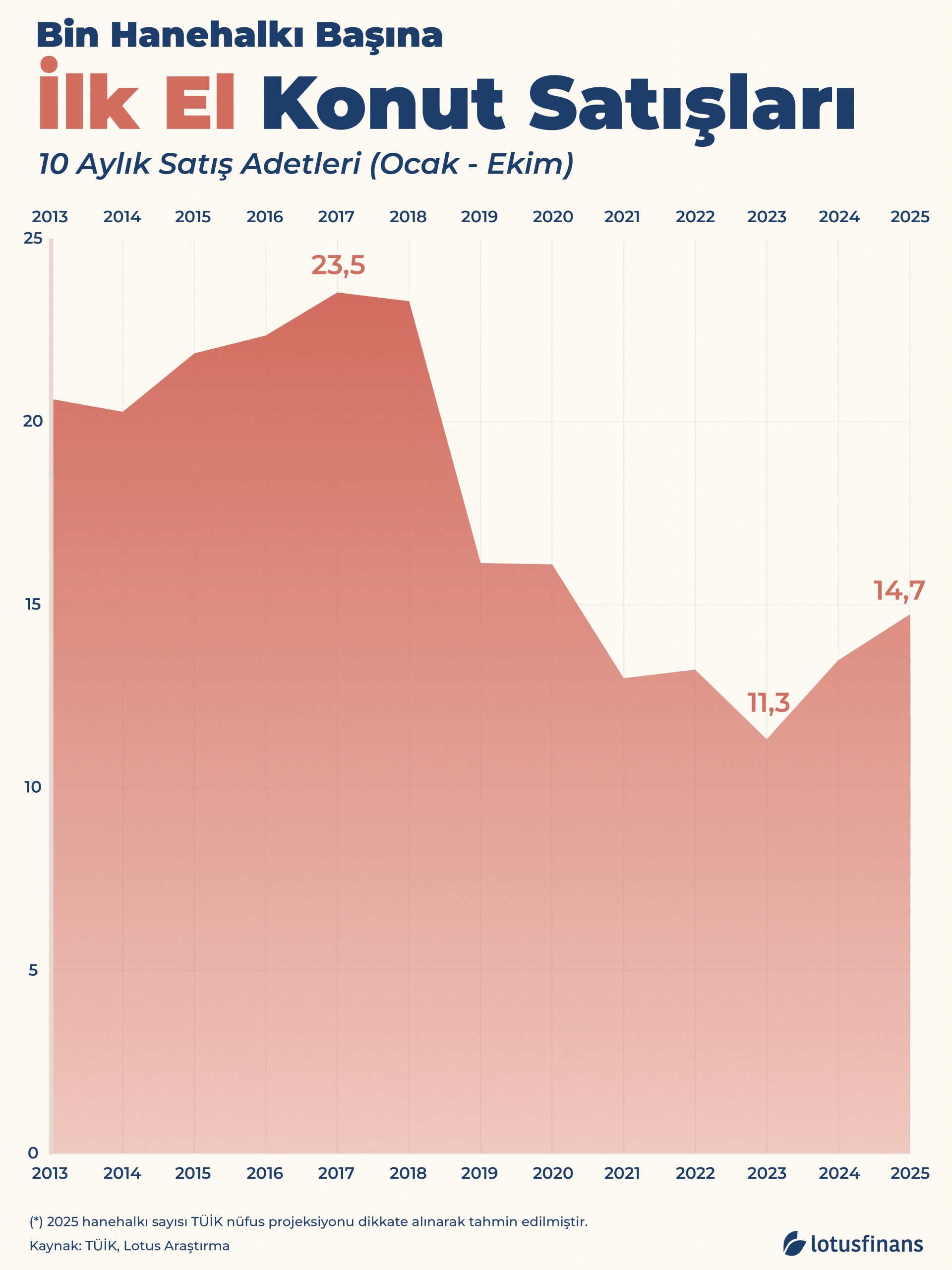 Türkiye’de hanehalkı sayısı her yıl artarken, ortalama hanehalkı büyüklüğü ise küçülüyor. 2017–2018’de hanehalkı sayısına oranla en yüksek konut alımı gerçekleşmişti. Son yıllarda bu oran dip seviyelere gerilese de 2023 sonrasında hanehalkı başına düşen ilk el konut alımı yeniden toparlanma belirtileri gösteriyor.