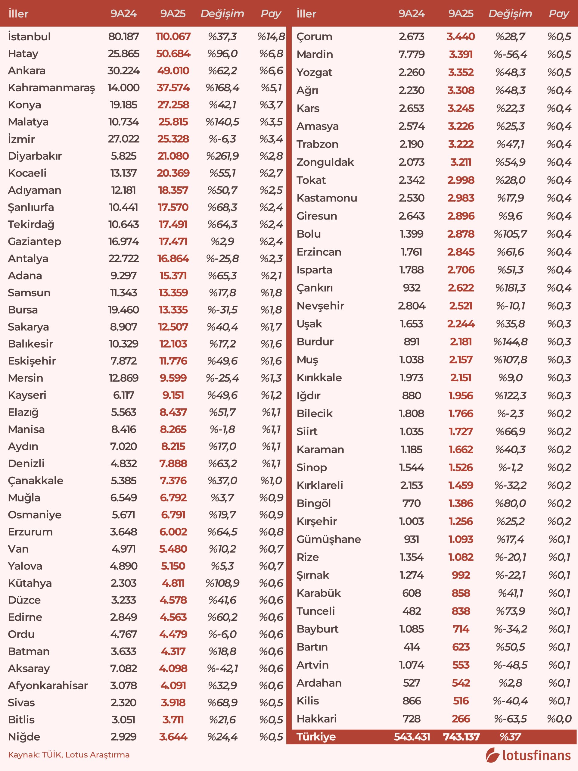 2024’ün ilk 9 ayında 543 bin düzeyindeyken, 2025’in aynı döneminde 743 bine çıkarak yaklaşık %37 arttı. Yani bir yılda 200 bin adet daha fazla ruhsat alındı.