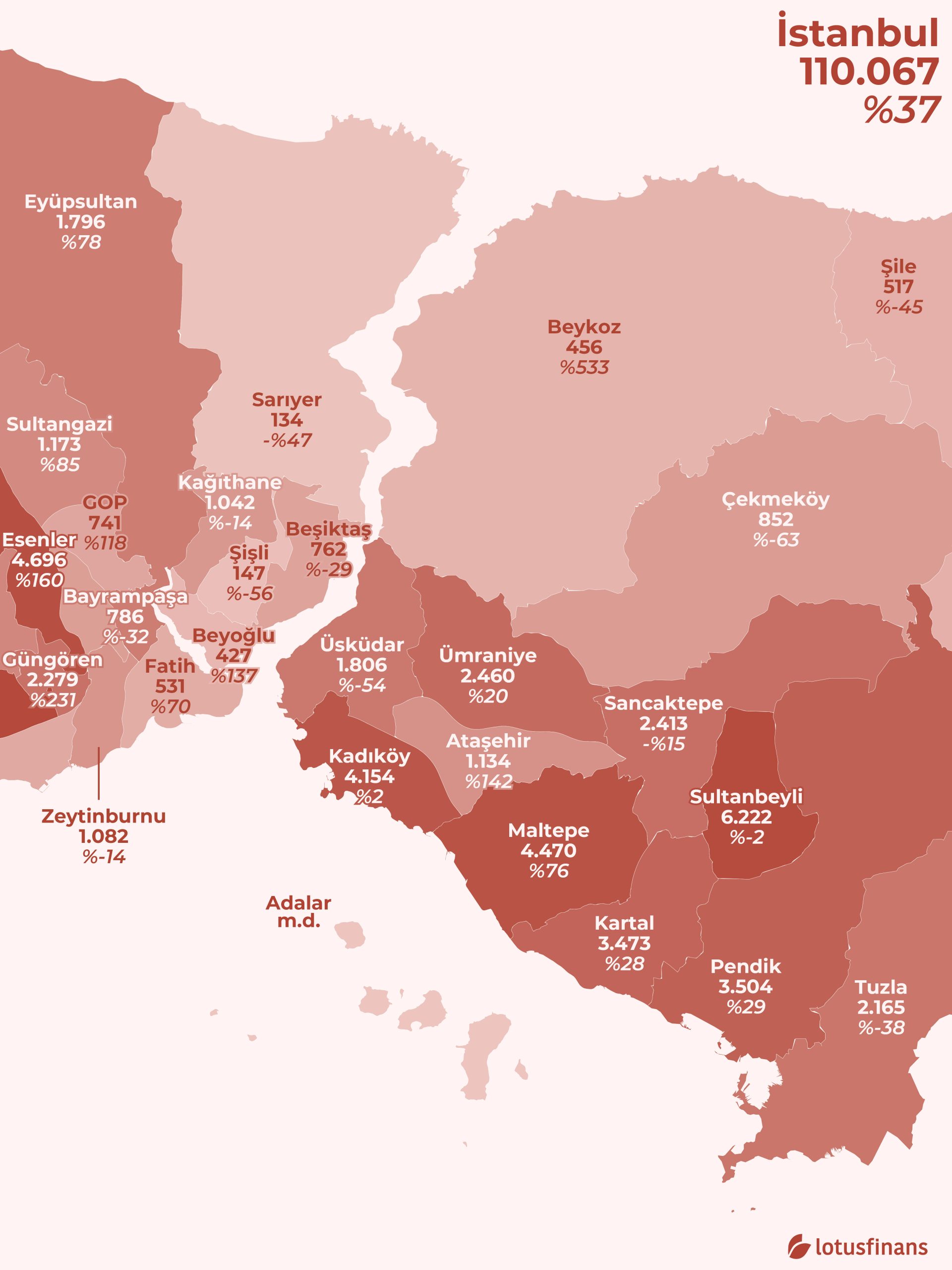 İstanbul genelinde daire ruhsatı sayısı geçen yılın aynı dönemine göre yaklaşık 30 bin adet arttı. Bunun 20 bin adedi tek başına Arnavutköy’den geliyor. Arnavutköy dışındaki tüm ilçelerin net artışı ise toplamda 10 bin civarında kalıyor; yani büyümenin ana gövdesi tek bir ilçede yoğunlaşıyor.