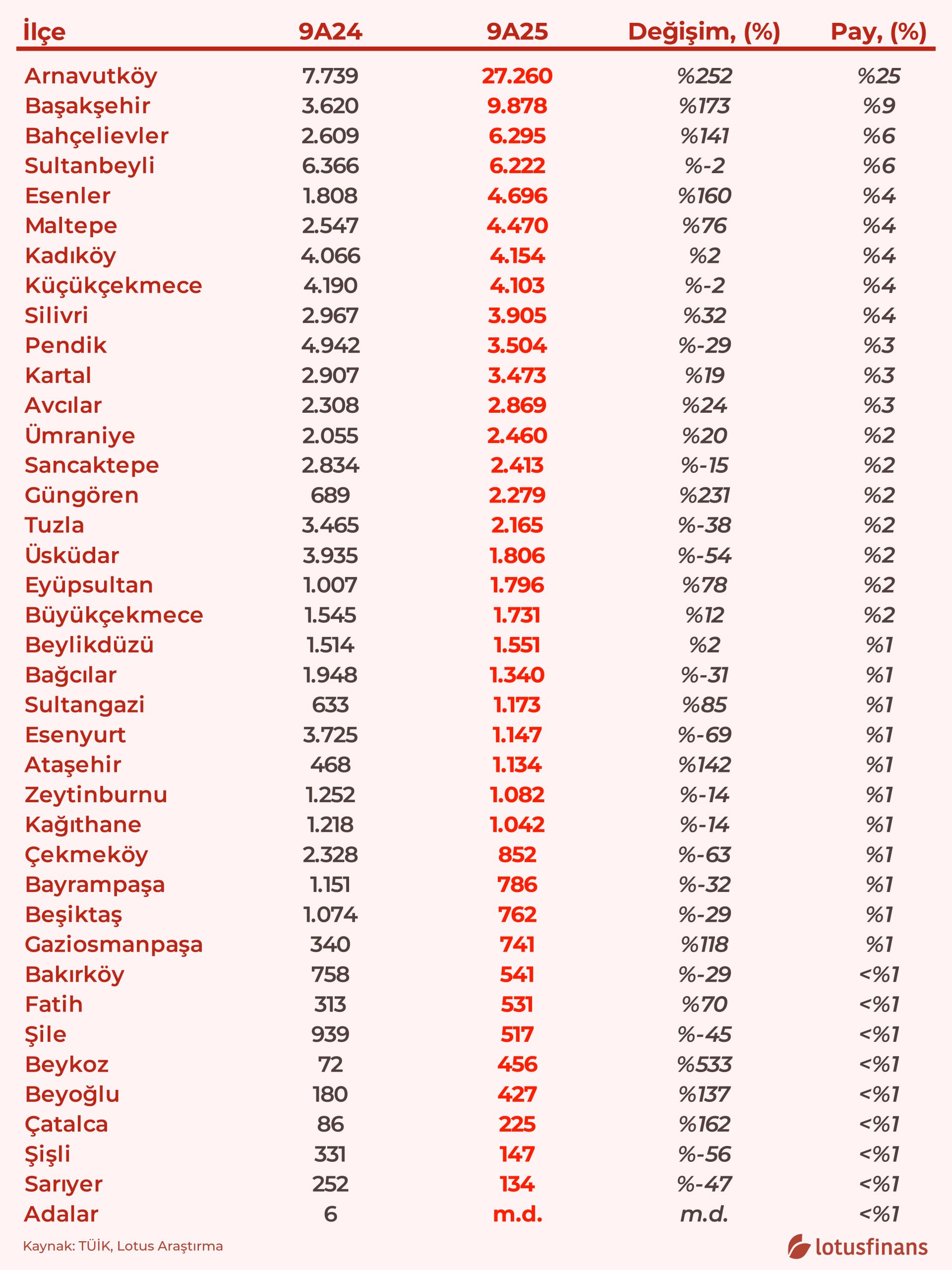2025’in ilk 9 ayında İstanbul’da ikamet amaçlı yaklaşık 110 bin daire için ruhsat alındı. Bunun 27 bini Arnavutköy’de. Yani şehirde alınan her 4 daire ruhsatının 1’i artık Arnavutköy’de kesiliyor. İlçenin payı %25 ile 2010’dan bu yana hiçbir ilçenin ulaşamadığı bir seviyeye çıkmış durumda.