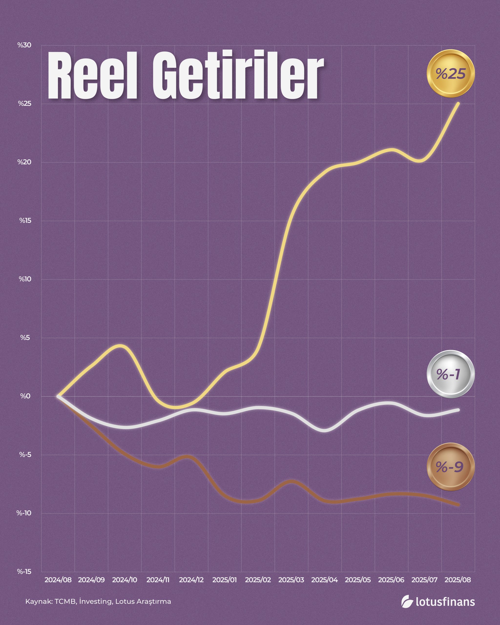 Not: Reel getiriler, Ağustos 2024–Ağustos 2025 için Ağustos’a göre Ağustos enflasyondan arındırılmış kümülatif performansı yansıtıyor. Nominal getirilerde altın ve dolar günlük serilerde son güncel kapanış değerleriyle, konutta ise son yayımlanan endeks seviyesi esas alınmıştır.