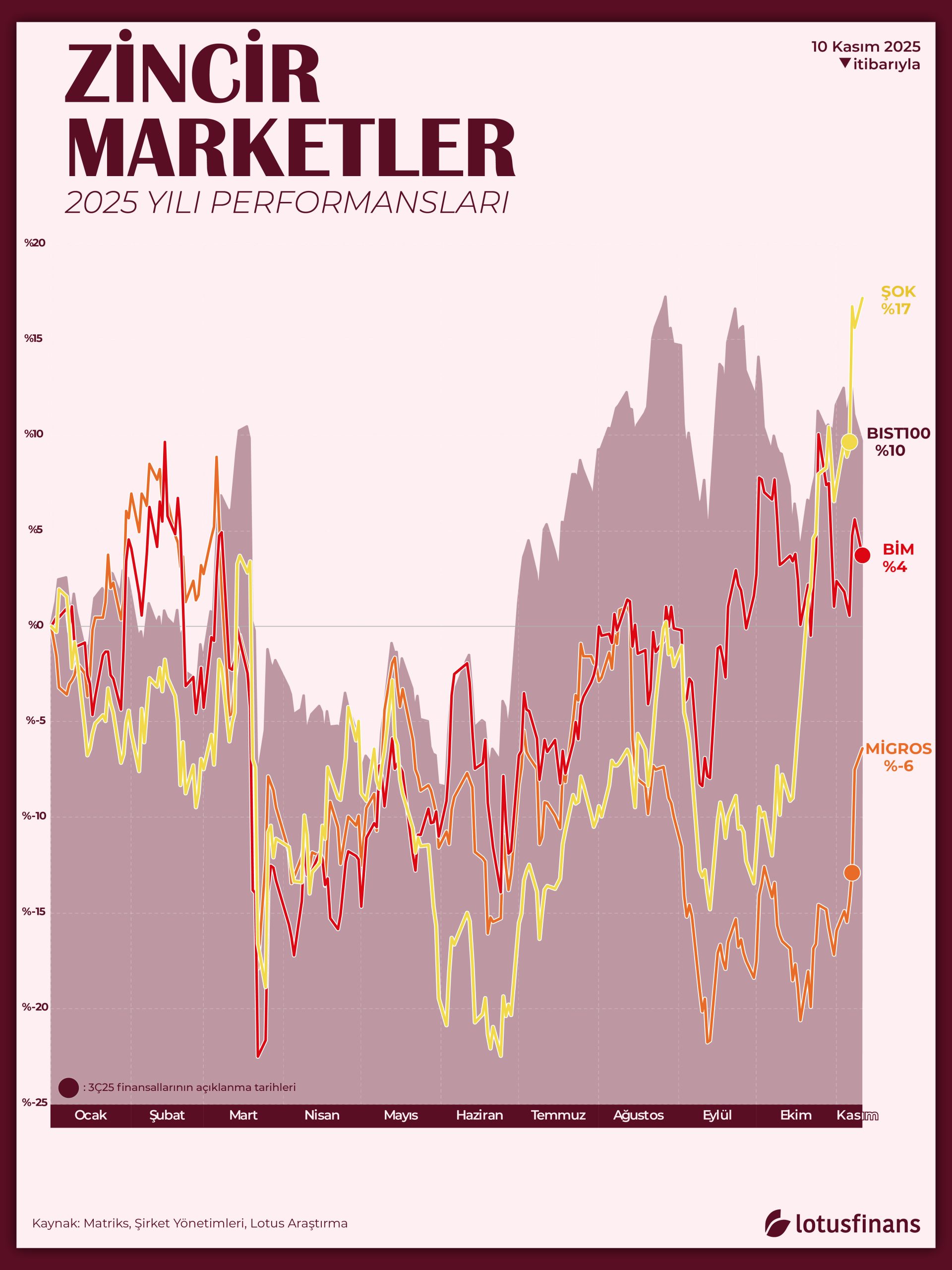 Şok Marketler, 3Ç25 finansallarında beklentilerin üzerinde gelen ciro ve FAVÖK sayesinde kısa sürede hızlı bir yükseliş yaşadı ve BIST100’ün üzerine çıktı. Ancak yılbaşından bugüne bakıldığında, yüksek enflasyon karşısında yatırımcı henüz reel anlamda korunabilmiş değil.