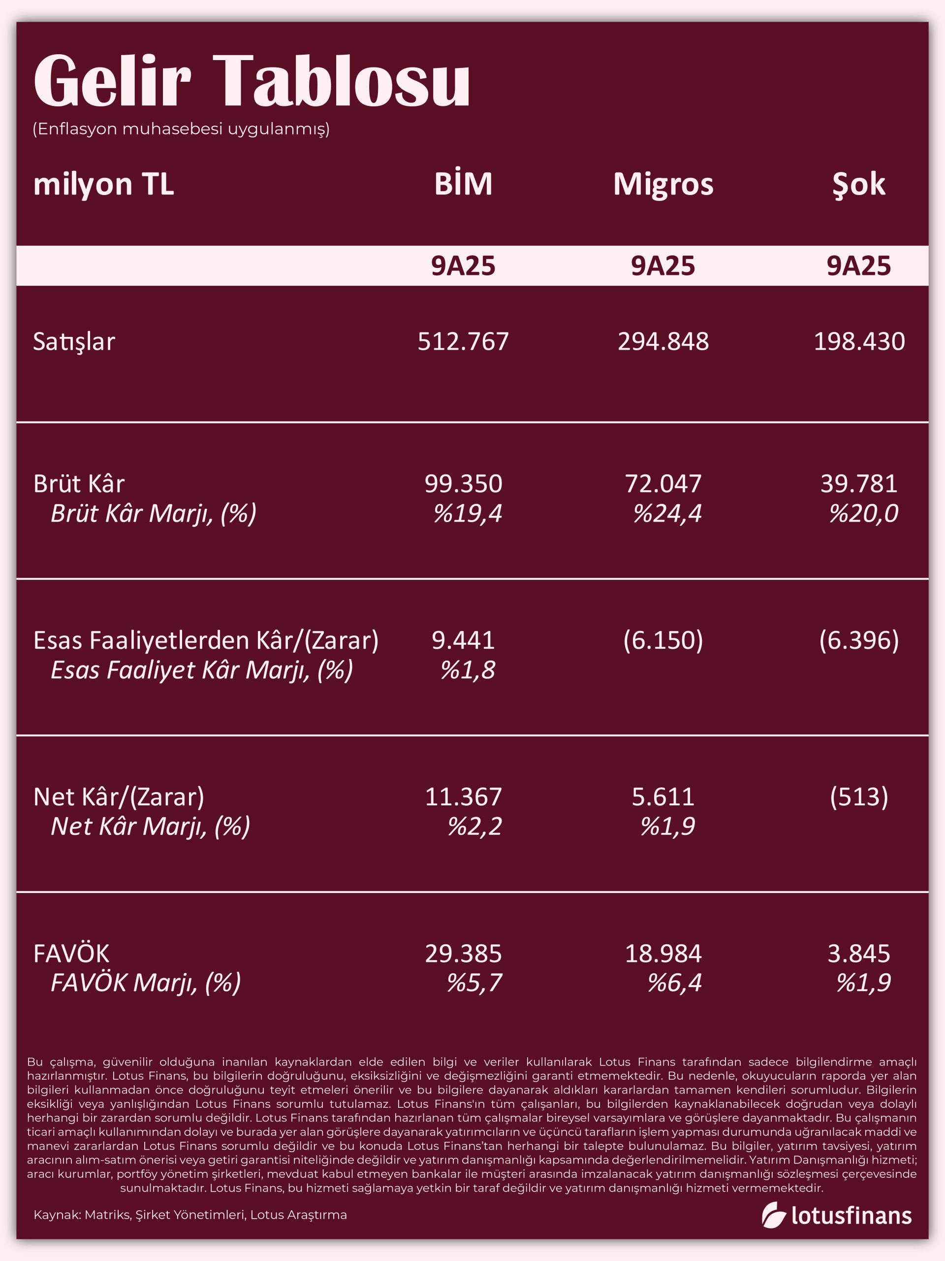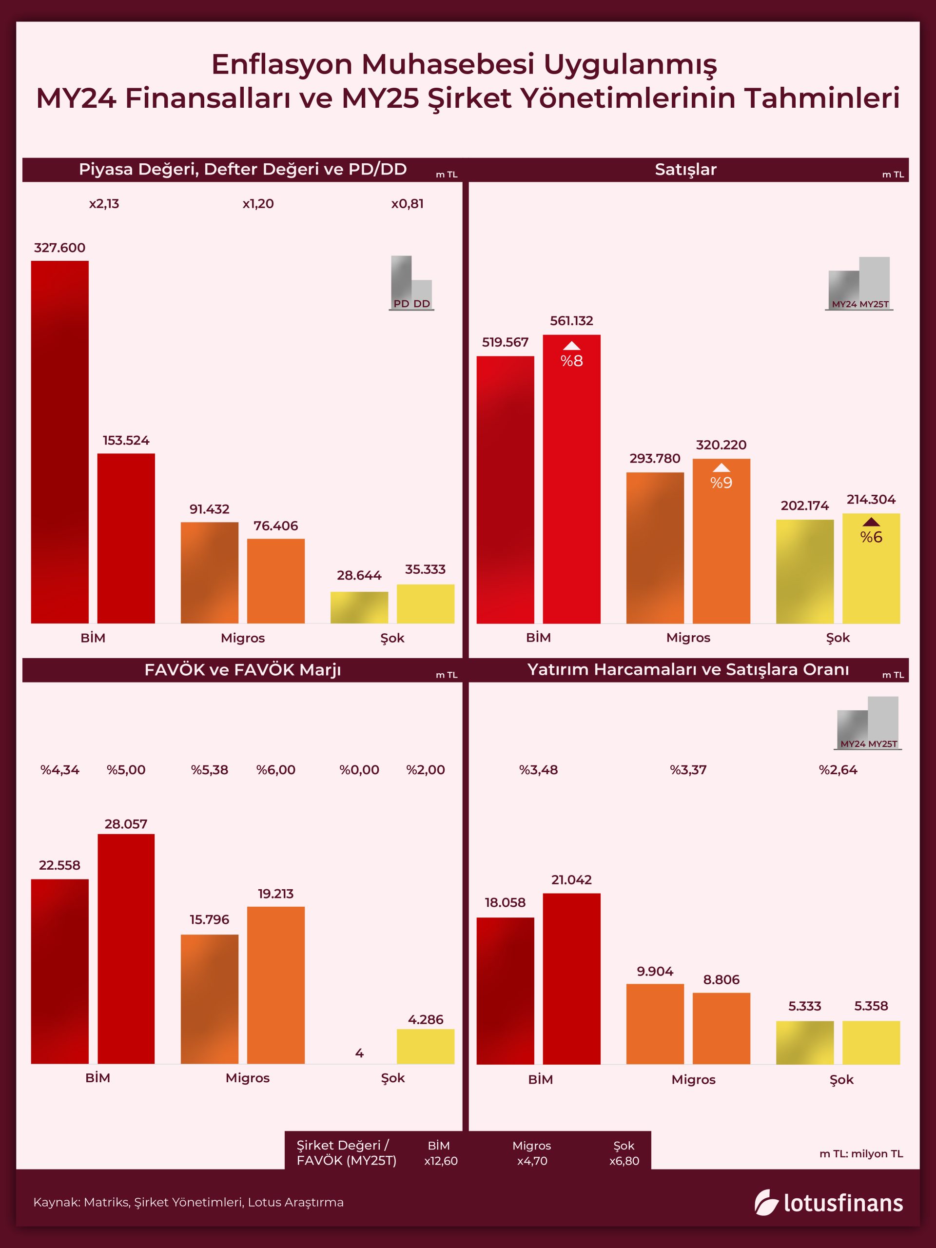 Mağaza başına ortalama günlük satışta BİM, Şok’un yaklaşık iki katı seviyesinde. Sepet hacmi ve mağaza başı müşteri sayısı verileri de BİM’in ölçek avantajını koruduğunu gösteriyor. Enflasyon muhasebesi uygulanmış finansallarda BİM’in FAVÖK büyüklüğü ve marjı, sektörde görece daha güçlü konumda kalıyor.
